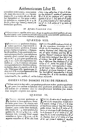 p. 61 contains Diophantus' problem II.VIII, with the famous note added by Fermat which became known as Fermat's last theorem.