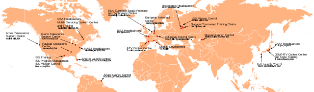 English: A map of space centers involved in the International Space Station. It is based on the map on page 3 of this PDF, a NASA publication.