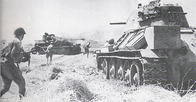 Türkçe: Polkovodets Rumyantsev Harekâtı sırasında Harkov civarında Kızıl Ordu'ya bağlı T-34 tankı ve askerler (Ağustos 1943)