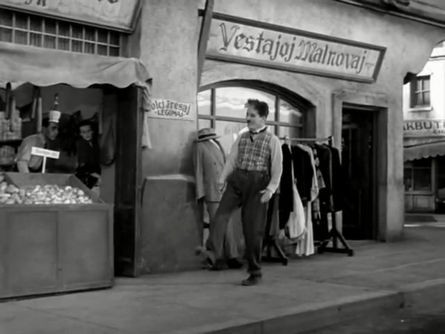 Português: Captura de tela do filme O Grande Ditador, de Charlie Chaplin. A placa diz: "Vestajoj Malnovaj" (sic; trad.: "Roupas Velhas"). Na imagem, falta um acento circunflexo na letra "j".