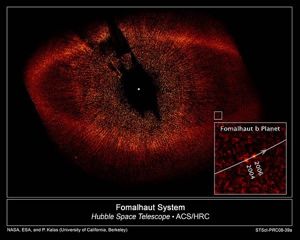 English: This image, taken with the Advanced Camera for Surveys aboard NASA's Hubble Space Telescope, shows the newly discovered planet, Fomalhaut b, orbiting its parent star, Fomalhaut.The small white box at lower right pinpoints the planet's location. Fomalhaut b has carved a path along the inner edge of a vast, dusty debris ring encircling Fomalhaut that is 21.5 billion miles across. Fomalhaut b lies 1.8 billion miles inside the ring's inner edge and orbits 10.7 billion miles from its star.