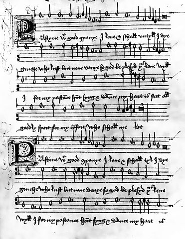facsimile of the scores for Pastime with good company, by King Henry VIII. The British Library, London. |