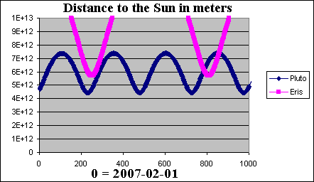 Plot of the distance to the Sun for Pluto, and Eris. It shows how Eris can be closer to the Sun than Pluto. This occurs since Eris has a perihelion (closest distance to the Sun) of 38.3 AU and Pluto has an aphelion (furthest distance from the Sun) of 49.3 AU. |