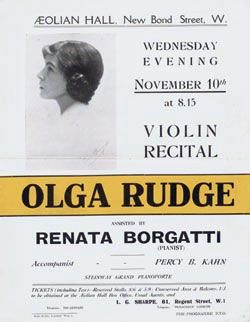 English: Advertisement for concert by violinist en:Olga Rudge and pianist en:Renata Borgatti, held at en:Aeolian Hall, London, November 10, 1920. For information on concert, see, e.g., Olga Rudge and Ezra Pound: "What thou lovest well-- " (2001), by Anne Conover Carson, pp. 45–46.