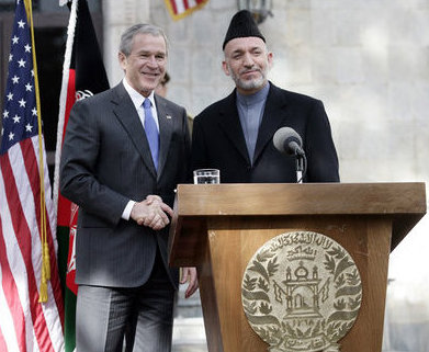 U.S. President George W. Bush and Afghan President Hamid Karzai appear together Wednesday, March 1, 2006, at a joint news conference at the Presidential Palace in Kabul, Afganistan. |