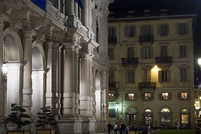 The house Nietzsche stayed in while in Turin (background, right), as seen from across Piazza Carlo Alberto, where he is said to have had his breakdown. To the left is the rear façade of the Palazzo Carignano. |
