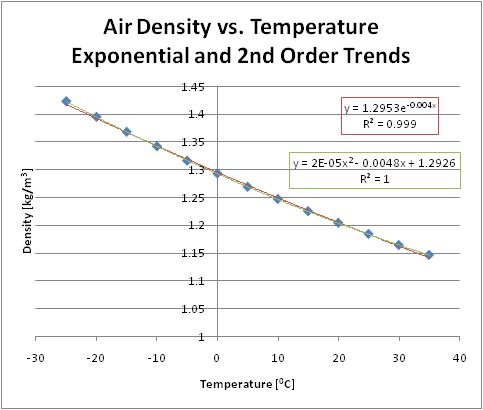 English: Air density vs. Temperature Graph with exponential and polynomial (2nd) trends