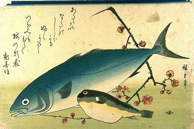 Ando en:Hiroshige (1797 - 1858): A Shoal of Fishes. (set of 15 prints). This image shows "inada & en:fugu ( en:Japanese amberjack= Seriola quinqueradiata & puffer/blowfish)" woodcuts, 26 X 36 cm. 15 of 20 total woodcuts, published 1832