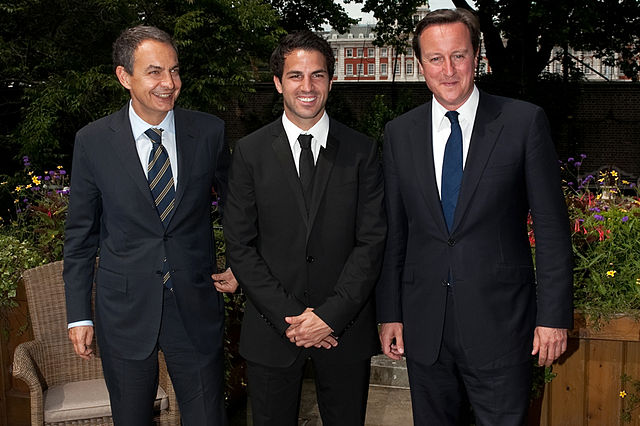 Español: El futbolista español Cesc Fabregas con el Primer Ministro del Reino Unido, David Cameron en Julio de 2011. También está en la imagen, el Presidente de España; Rodríguez Zapatero