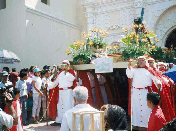 Holy Week procession in Comayagua, Honduras. Some 40 men (and some women) are carrying a statue of Christ carrying the Cross. |