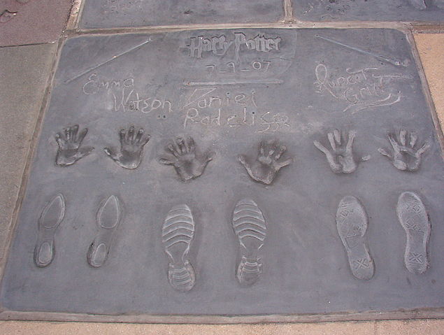 English: Here are the handprints, footprints and wand prints of the three main stars of the Harry Potter films (from left to right: Emma Watson, Daniel Radcliffe, Rupert Grint).