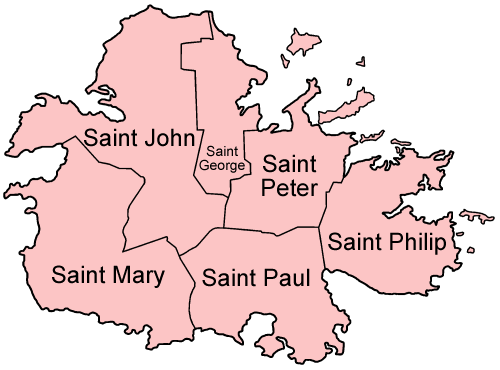 Map of the parishes of Antigua, named, for people who want to print a map or not deal with the numbered maps.