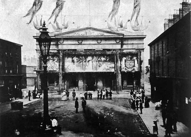 English: The Crimean War Pear Celebrations. A painting hangs from the front portico of the Town Hall, lit by gas burners. In the centre, PEACE holds an olive branch and globe, to the left a lion and lamb represent tranquillity, figures of AGRICULTURE stand with vegetables, MUSIC, LYRES and POETRY are also used. A seaport shows the prosperity from peace. On the right of PEACE, a snapped sword, the crown of victory, JUSTICE holds a balance, UNITY a bundle of rods. A veil hides the figure of War from Peace. The arms of Salford and the Duchy of Lancaster are represented along with the Royal coat of arms. Above the building fly the flags of France, Turkey, Sardinia and Russia, with Britain in the middle.