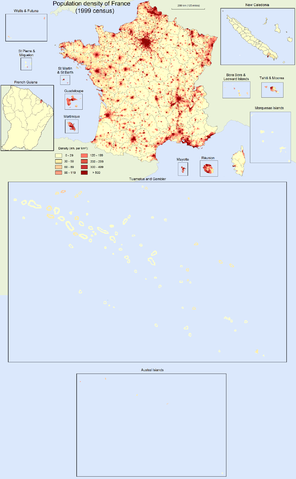 Density is as of 1999 census for Metropolitan France, Réunion, French Guiana, Martinique, Guadeloupe, St Martin & St Barth, and St Pierre & Miquelon. Density is as of 2002 census for Mayotte, Tahiti & Moorea, Bora Bora & Leeward Islands, Marquesas Islands, Tuamotus & Gambier, and Austral Islands. Density is as of 2003 census for Wallis & Futuna. Density is as of 2004 census for New Caledonia.