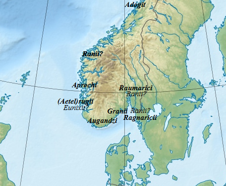 English: Locations of the Norwegian tribes described by Jordanes in Getica, as identified by modern historians.