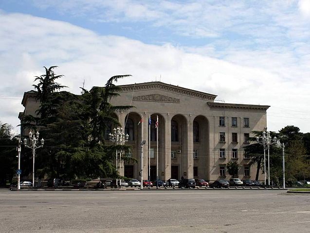 Русский: Рустави, здание бывшего горкома партии. напротив стоял Ленин. сейчас вместо Ленина сад камней. Главная улица старого Рустави - это улица Мераба Костава, которая начинается от моста через Куру (там стоит железная пирамида с намеком на Лувр) и упирается в металлургический комбинат. 1600 метров длиной, посередине центральная площадь. Причем если от моста до площади Костава это улица и обсадка по краям, то от площади до комбината - это аллея по центру и улицы с краев. На Коставе сосредоточена вся жизнь города.