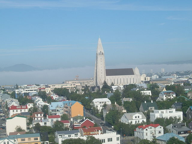 Approach to runway 19 at BIRK Reykjavík City Centre Airport, which has a glideslope right over downtown Reykjavík. You can easily see the Hallgrimskirkja church dominating the Reykjavík skyline with old town Reykjavík surrounding the church.