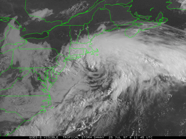 This image shows re-generated Tropical Storm Danny off the coast of Massachusetts on July 25, 1997 with winds of 60 mph. |