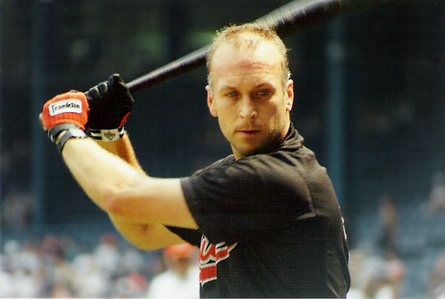 American professional baseball player Cal Ripken practices his swing before a game at Tiger Stadium in Detroit, Michigan, in 1993; by Rick Dikeman.