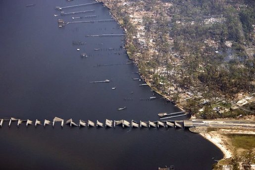Structural bridge damage caused by Hurricane Katrina can be seen from aboard Air Force One Wednesday, Aug. 31, 2005,