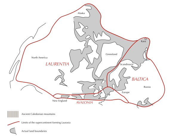 English: Translated File:Laurussia_fr.svg from French, author Thomas Robert, edited by Max Naylor using Adobe Illustrator CS2. Map of the Eurasian supercontinent (Devonian).