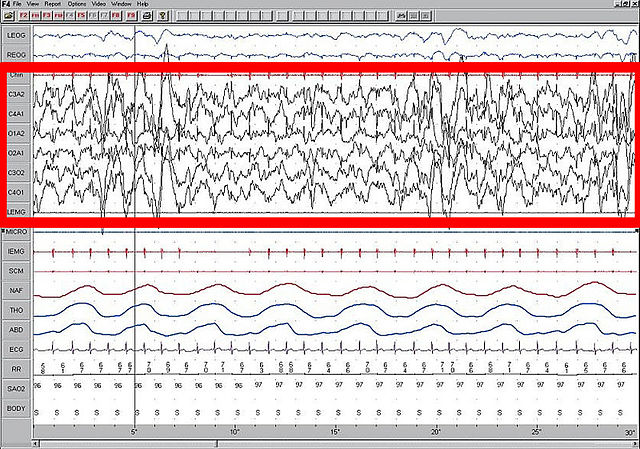 This is a screen shot of a patient during Slow Wave Sleep (stage N3). The high amplitude EEG is highlighted in red. This screen shot represents a 30 second epoch (30 seconds of data).