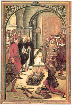 St. Dominic de Guzman and the Albigensians. Panel by Berruguete, 15th century.