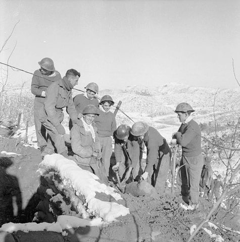 King's Regiment group, Korea 1952.jpg THE KOREAN WAR 1950 - 1953. Company Sergeant Major Harry McDortch (without headgear), "A" Company, 1st Battalion, The King's Liverpool Regiment, pays a routine visit to one of the forward platoons of his company serving at the front in Korea. The men in this photograph are digging in a new bunker, a job which helped to keep them warm in the cold Korean winter.