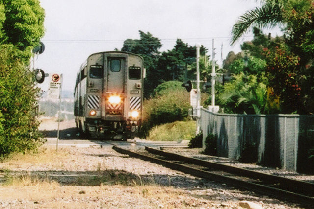 English: Northbound Surfliner Cab Car crosses Carlsbad Village Dr. in Carlsbad, Ca. By Patrick Todd, 2005