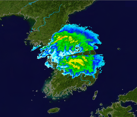 Radar data from U.S. Air Force WSR-88Ds in South Korea at Camp Humphreys Airbase (RKSG), from 2006-07-10 when Severe Tropical Storm Ewiniar made landfall, overlaid on NASA Blue Marble base map. |