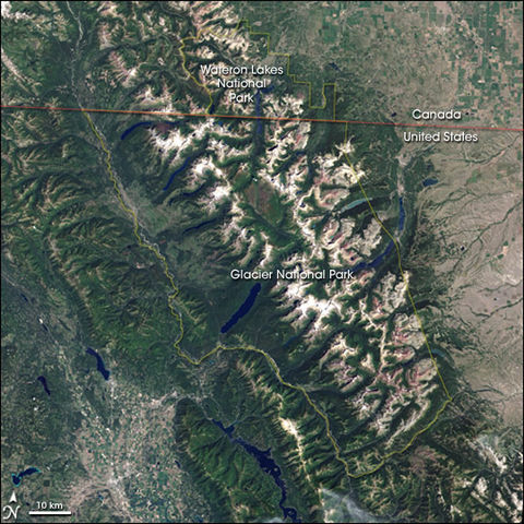 w:Landsat 7 natural-colour image of Glacier National Park (USA) and Waterton Lakes National Park. |