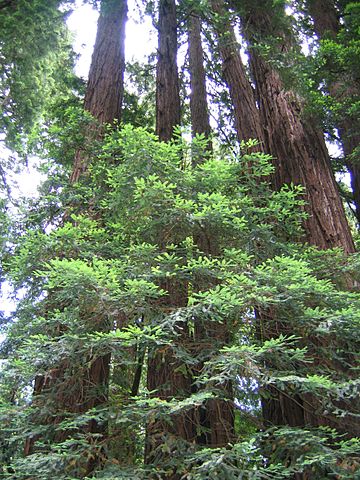 This ring of Coast Redwoods Sequoia sempervirens sprouted from the stump of an older tree. When we have a ring of trees like this, it's called, appropriately, a family ring. This picture was taken from the Muir Woods National Monument. It's a really nice place. |