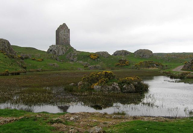 Smailholm Tower, Scotland, view from the east across the lochan from near Sandyknowe Farm, childhood home of Walter Scott. |