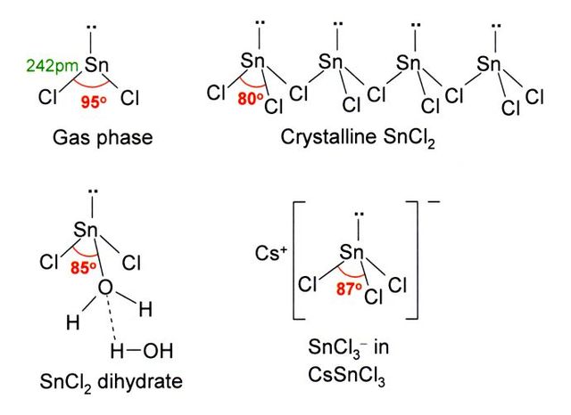 Structure of tin(II) chloride (stannous chloride) and related compounds. Drawn in IsisDraw in colour, scanned and uploaded by w:User:Walkerma, June 10th 2005. Examples chosen from N. N. Greenwood, A. Earnshaw, Chemistry of the Elements, 2nd ed., Butterworth-Heinemann, Oxford, UK, 1997.