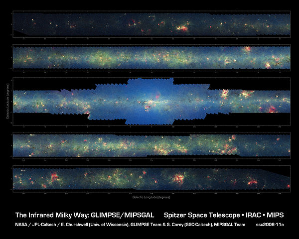 English: The Spitzer Space Telescope's broad infrared view of our Milky Way Galaxy. The image was created from more than 800,000 frames, so it is the most detailed infrared picture of our galaxy to date.
