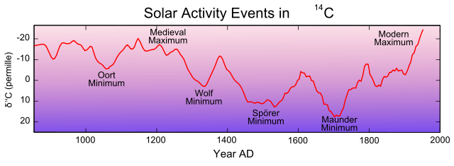 English: Changes in the 14C record, which are primarily (but not exclusively) caused by changes in solar activity. Note that "before present" is used in the context of radiocarbon dating, where the "present" has been fixed at 1950.