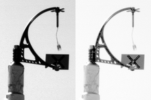 English: Phoenix Mars spacecraft's MET weather mast on the surface of Mars, as imaged by Phoenix at Sol 2, day 3 after landing to show the tell-tale at 2.3 metre height that indicates wind-strength and direction. This image is a crop and selected gamma 4.01 enhancement of the full image to show the tell-tale reflected in the rectangular mirror: the diagonal black cross is a reflection of the horizontal cross at the top of the thin tube with white dots to indicate wind-strength. The view is approximately South-West, and the tell-tale appears blown towards the camera, which indicates the wind is from the North East.The telltale was made by Denmark's Aarhus University.