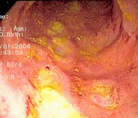 English: Endoscopic image of Crohn's colitis showing deep ulceration in sigmoid colon.