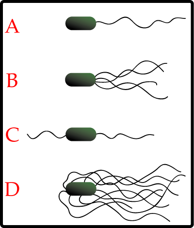 Examples of bacterial flagaella arrangement schemes. A- Monotrichous; ex. Pseudomonas Fluorsecens B- Lophotrichous; C- Amphitrichous; D- Peritrichous; Proteus mirabilis --Original work created for Wikipedia, by Mike Jones