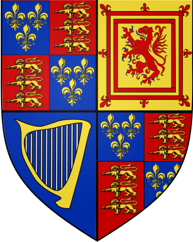 Coat of arms of the United Kingdom 1603-1707 Arms of England of 1405 quartered with Scotland and Ireland  Blazon: Quarterly, I and IV grand-quarterly I and IV azure three fleur-de-lis Or, II and III gules three lions passant guardant in pale Or armed and langued azure; II Or a lion rampant gules armed and langued azure within a double tressure flory-counter-flory gules; III azure a harp Or stringed argent. |