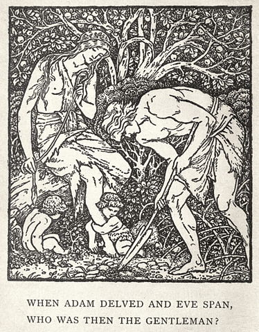 Artwork by E. Burne-Jones, April 1888, for the first book edition of William Morris' A Dream of John Ball. Illustrates the couplet "When Adam delved and Eve span / Who was then the gentleman?" which had international popularity in several Germanic languages as an equalitarian slogan during the medieval period. |