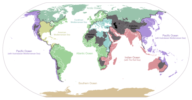 English: I made this map and hereby release it into the public domain. It shows the drainage basins for the major oceans and seas; grey areas are endorheic basins that do not drain to the ocean. Data is from the USGS Hydro1k project; information for Saskatchewan corrected by information from the Commission for Environmental Cooperation -- Citynoise Description in large font size is used for oceans, in smaller font size is used for mediterranean seas. Only these mediterranean seas are listed which correspond to the definition of german Geographer Ernst Neef: A mediterranean sea is a sea between two Continents. Also found here: de:Mittelmeer -- W like wiki ( talk) 00:55, 12 March 2011 (UTC)