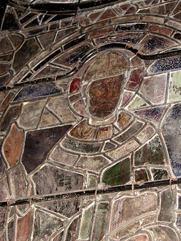 Canterbury cathedral, stained glass window showing detail of panel of St Thomas a Becket, photographed with flash. Image reveals the lead cames (H section) with soldered joints, the iron supporting rods and copper wire, the painted details on the surface of the glass. |