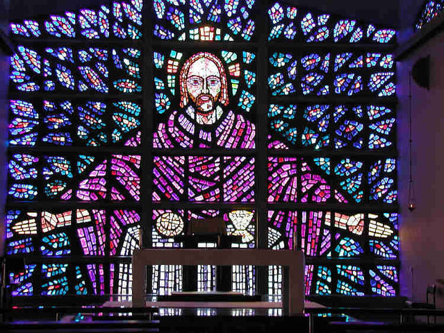 Stained glass in Buckfast Abbey, Devon, England. The panel was designed and installed by the monks who built the abbey. This window is a faceted glass window. It uses thick slabs of glass, sometimes 2 inches thick and cut with a chisel. The window is held together by an epoxy that binds to the edge of the glass.