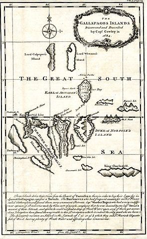 English: Map of the Galapagos Islands as described by Ambrose Cowley in 1684.