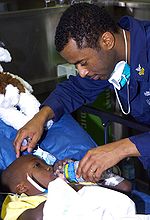 The U.S. Navy listed its resources in the area as "17 ships, 48 helicopters and 12 fixed-wing aircraft" in addition to 10,000 sailors and Marines. The Navy had conducted 336 air deliveries, delivered 32,400 US gallons (123,000 l; 27,000 imp gal) of water, 532,440 bottles of water, 111,082 meals and 9,000 lb (4,100 kg) of medical supplies by 20 January. Hospital ship Comfort began operations on 20 January, completing the arrival of the first group of sea-base vessels; this came as a new flotilla of USN ships were assigned to Haiti, including survey vessels, ferries, elements of the maritime prepositioning and underway replenishment fleets, and a further three amphibious operations ships, including another helicopter carrier, USS Nassau (LHA-4).