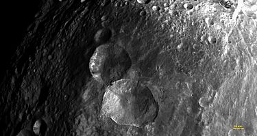 ![]() Composite Dawn spacecraft image of Vesta. Rheasilvia crater, with its massive central peak, covers much of the southern hemisphere (bottom); the 'snowman' craters are near the top left. Saturnalia Fossa runs obliquely near the terminator at upper right, with nearby grooves parallel to it. |
