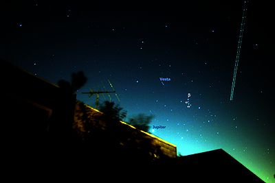 Vesta was at opposition again on Sunday, 9 December 2012. According to Sky and Telescope magazine, this year Vesta will come within about 6 degrees of 1 Ceres during the winter of 2012 and spring 2013. Vesta orbits the Sun in 3.63 years and Ceres in 4.6 years, so every 17 years Vesta overtakes Ceres (the last overtaking was in 1996). On December 1st 2012, Vesta had a magnitude of 6.6, but decreasing to 8.4 by May 1st 2013.
