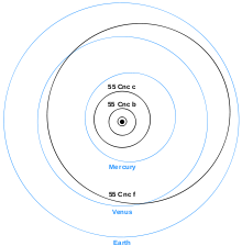 As of 2011, five extrasolar planets have been confirmed to be orbiting the primary, 55 Cancri A (the yellow dwarf). The 55 Cancri system was the first known to have four, and later five planets, and may possibly have more. The innermost planet, e, transits 55 Cancri A as viewed from Earth. The next planet, b, is close enough to edge-on that its upper atmosphere transits the star.