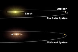 55 Cancri (pron.: / ˈ k æ ŋ k r aɪ / or / ˈ k æ ŋ k r iː /), also cataloged Rho1 Cancri or abbreviated 55 Cnc, is a binary star approximately 41 light-years away from Earth in the constellation of Cancer. The system consists of a G-type star and a smaller red dwarf, separated by over 1,000 AU (one thousand times the distance from the Earth to the Sun).